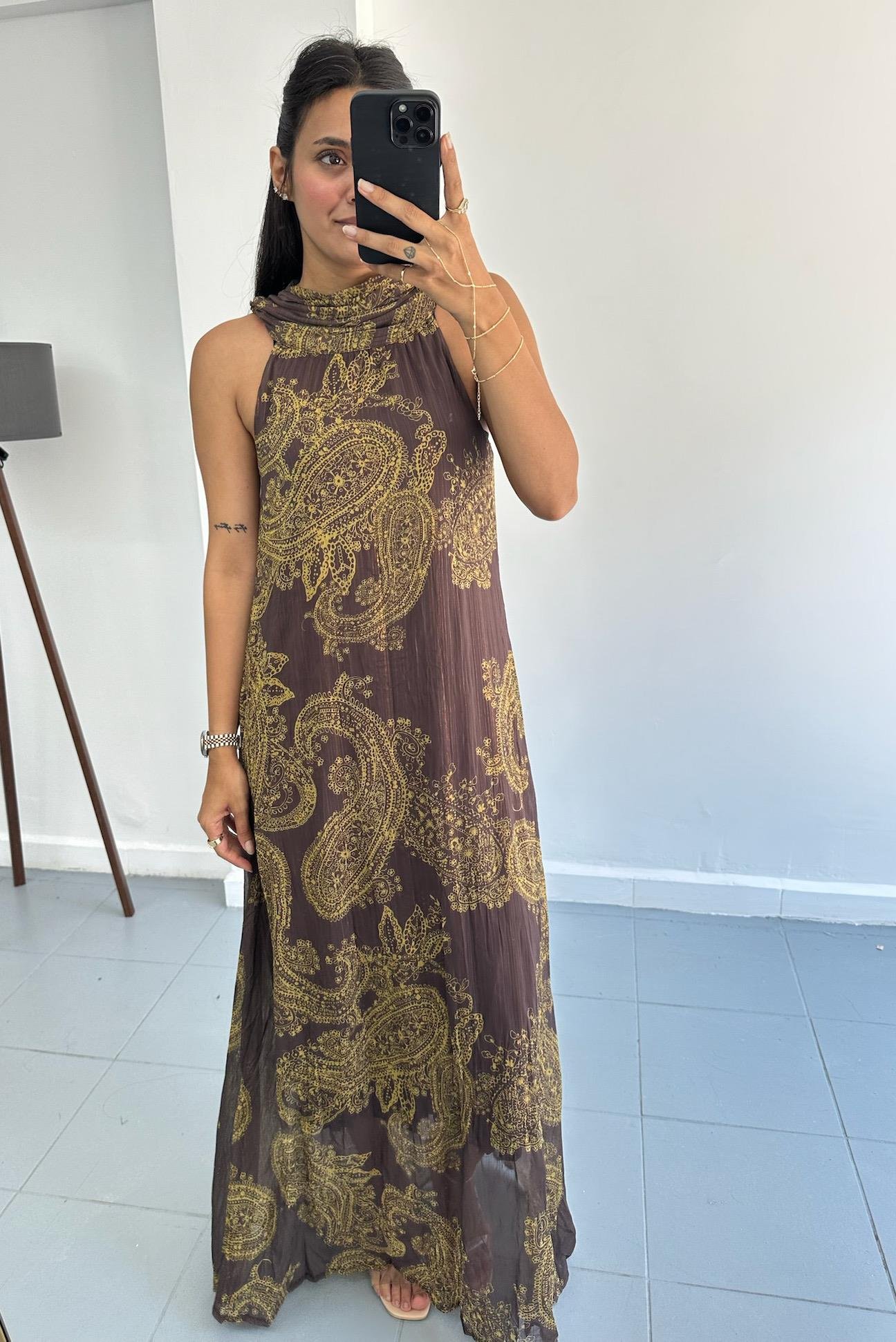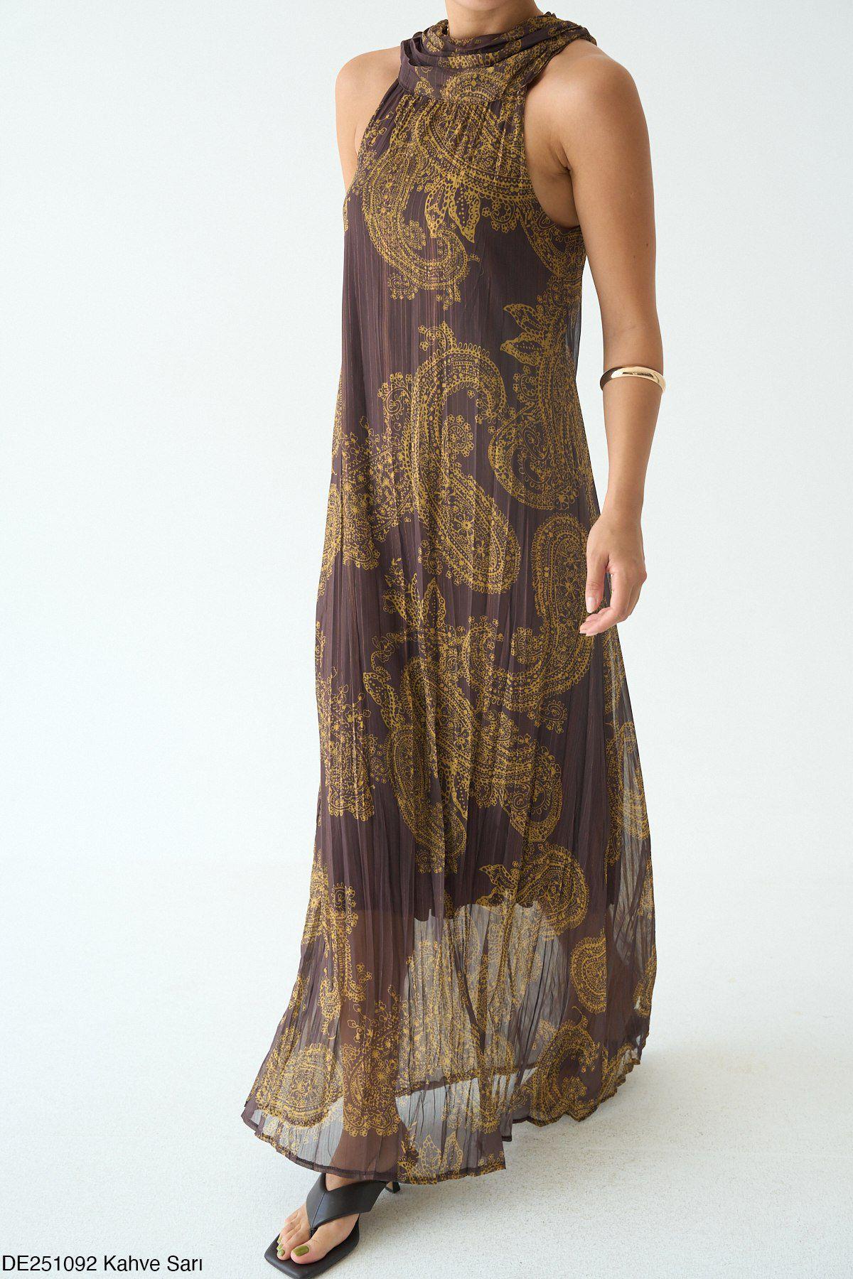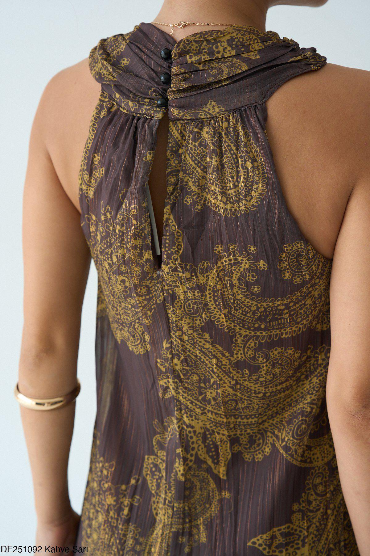 Sarı-Kahve Şal Desenli Halter Elbise