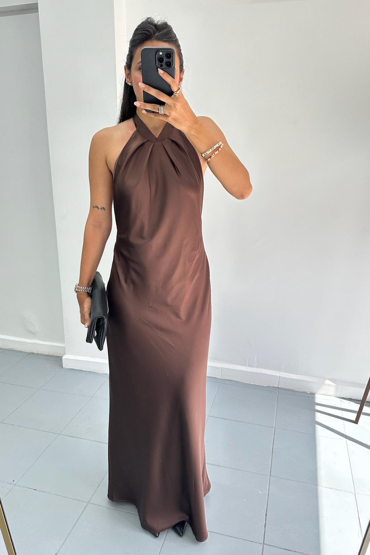 Sırt Detay Saten Maxi Kahverengi Elbise