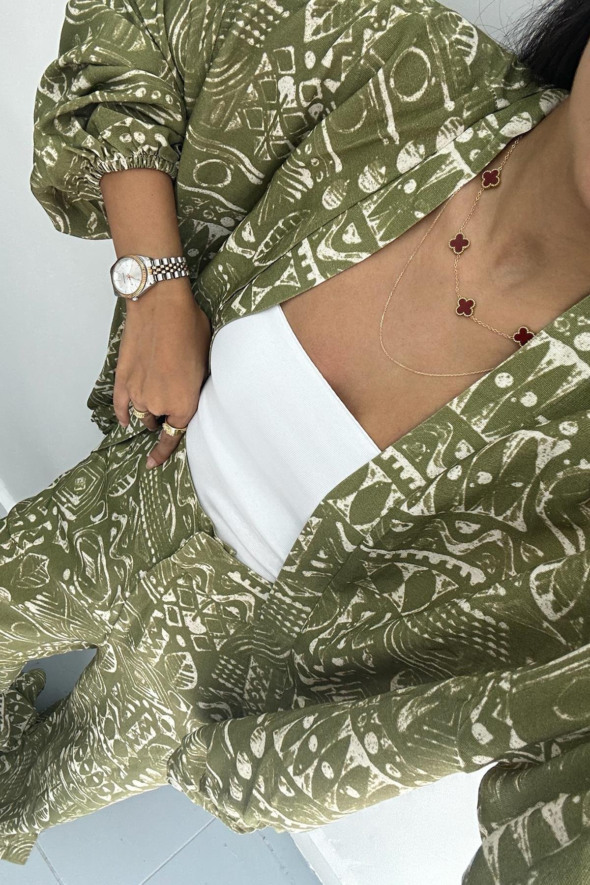 Sırt Detaylı Lastikli Haki Oversize Kimono