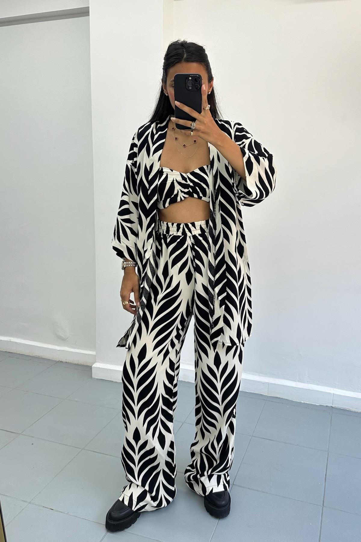 Siyah Beyaz Desenli Kimono Takım