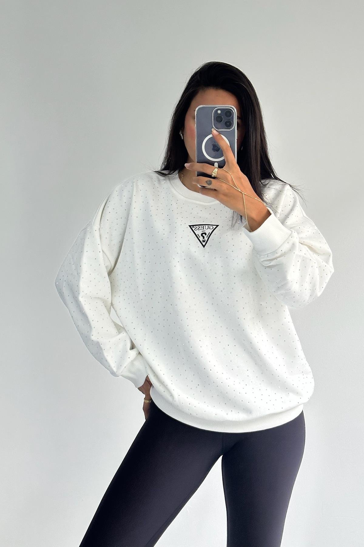 Taş Baskılı Bisiklet Yaka Beyaz Sweatshirt