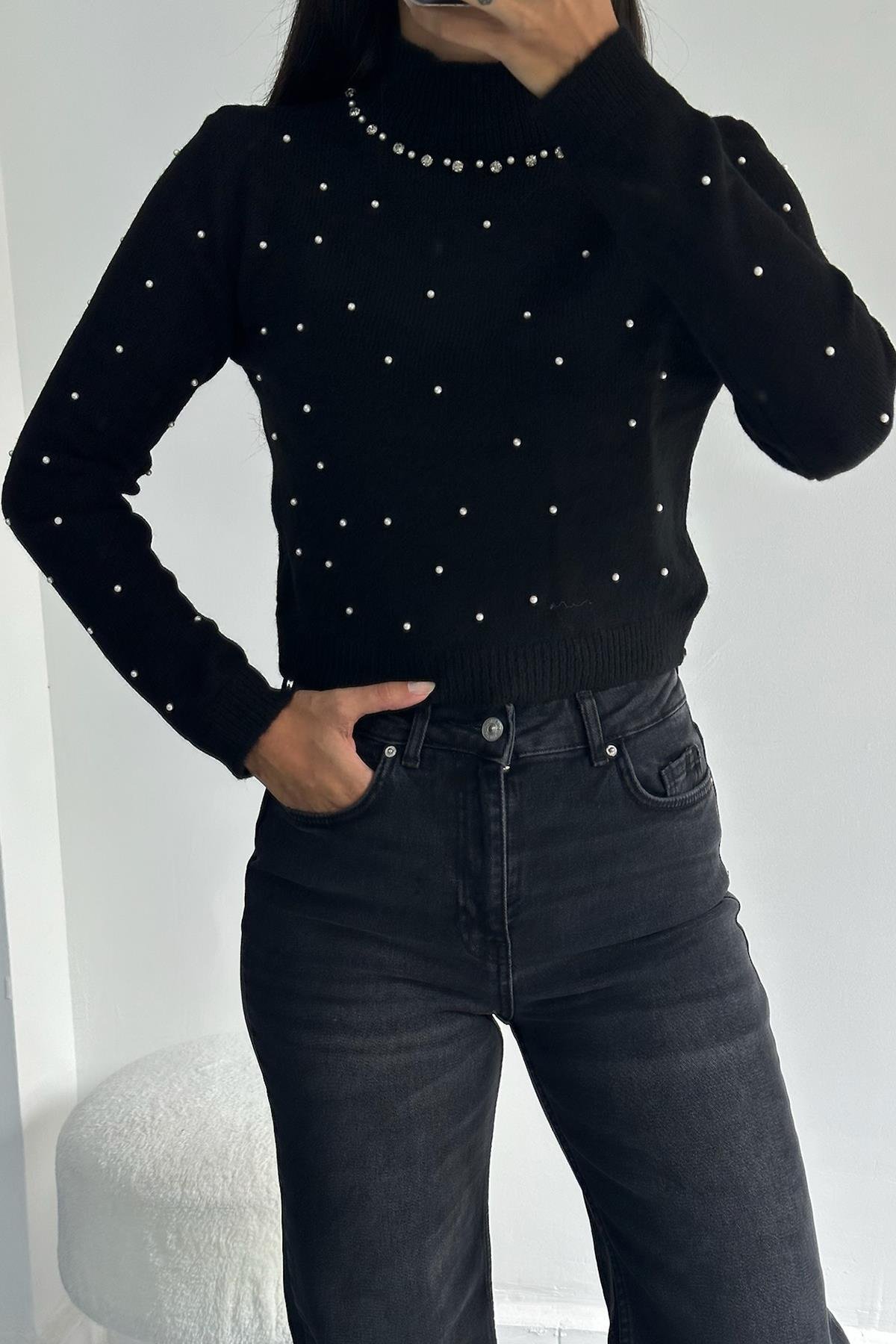Taş Ve İncili Dik Yaka Siyah Kazak