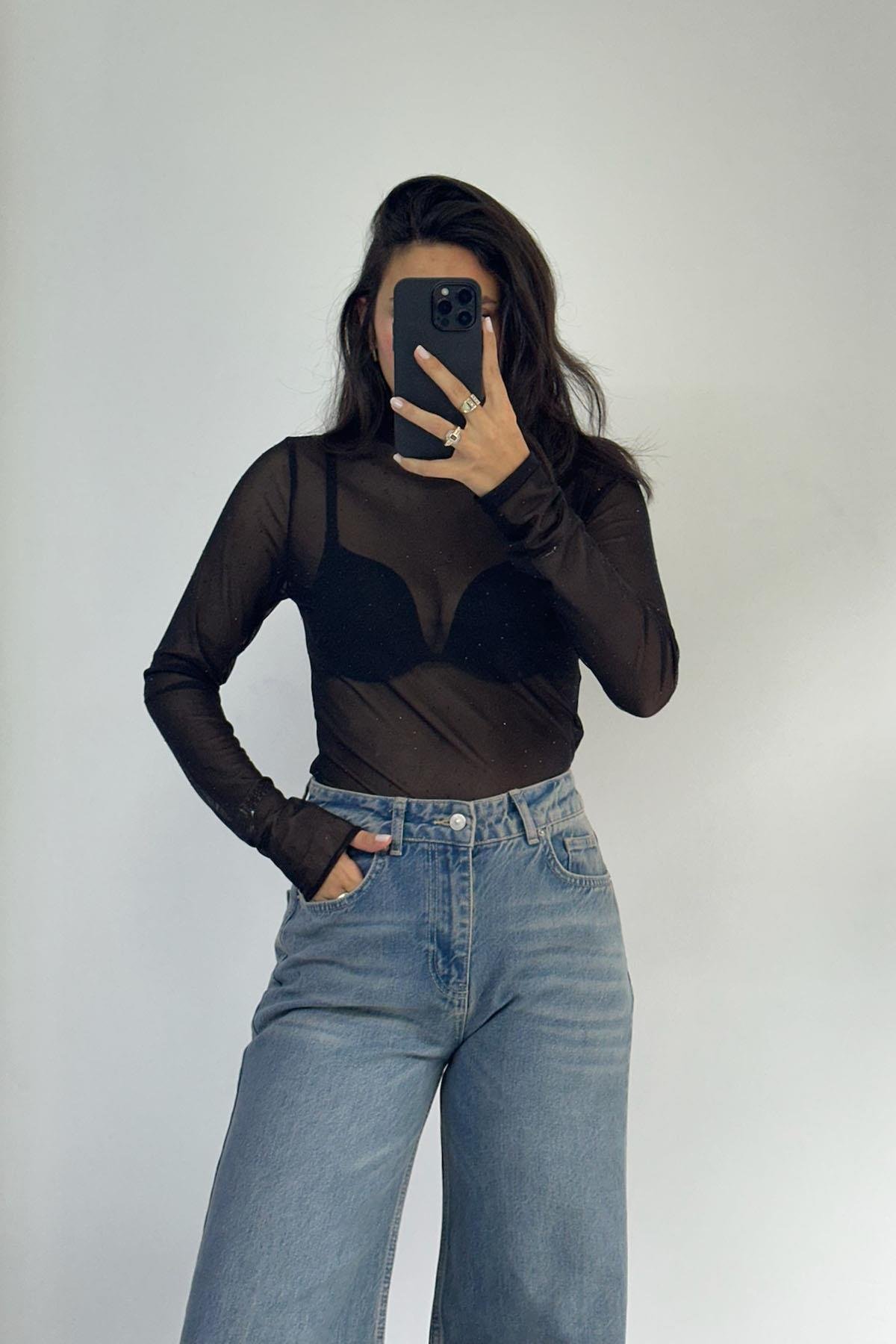 Taşlı Transparan Siyah Bluz