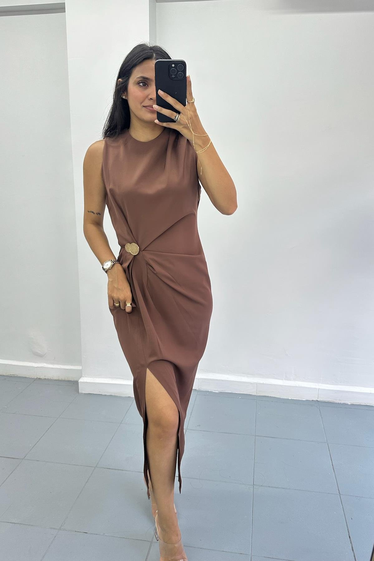 Toka Detaylı Kahverengi Midi Elbise