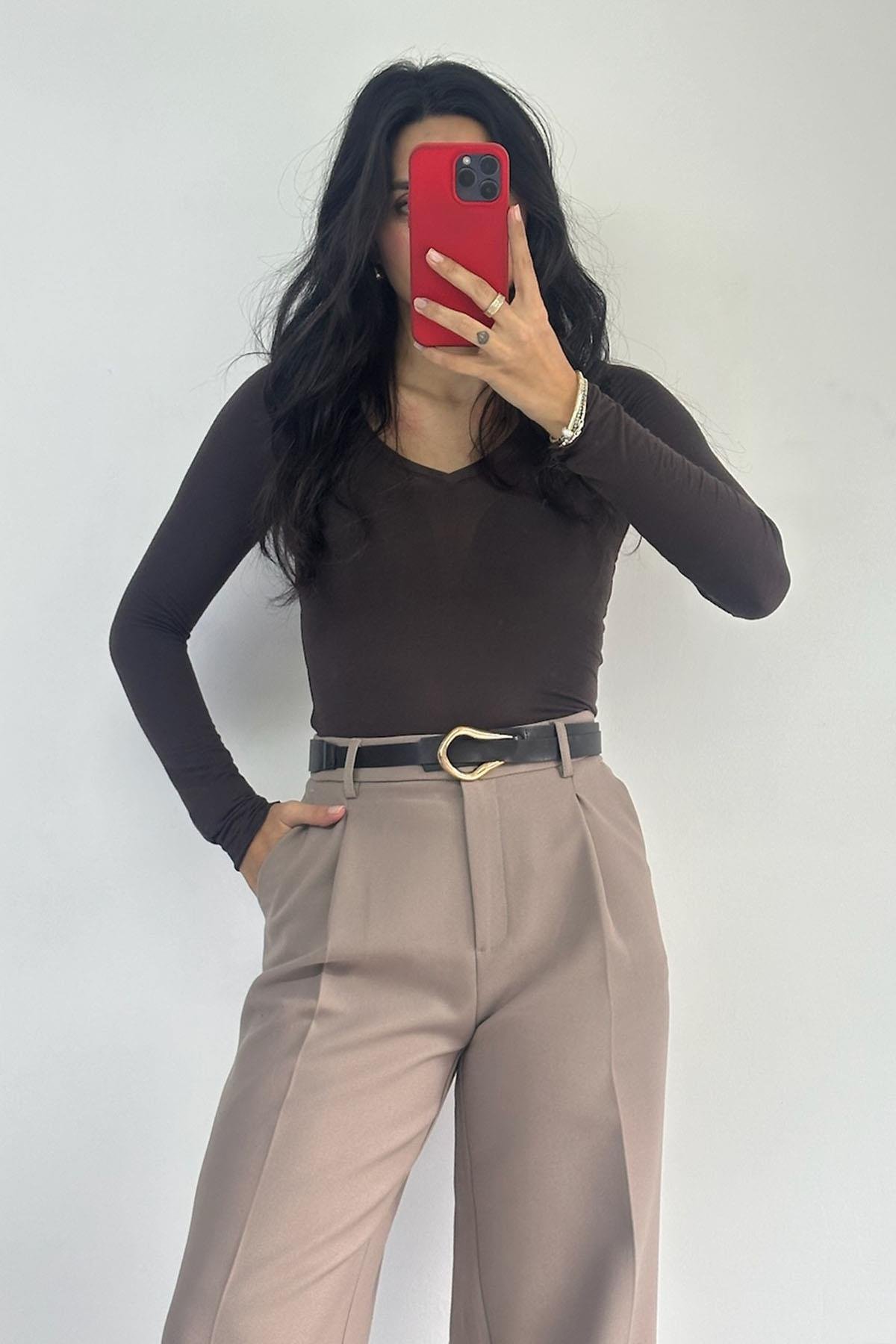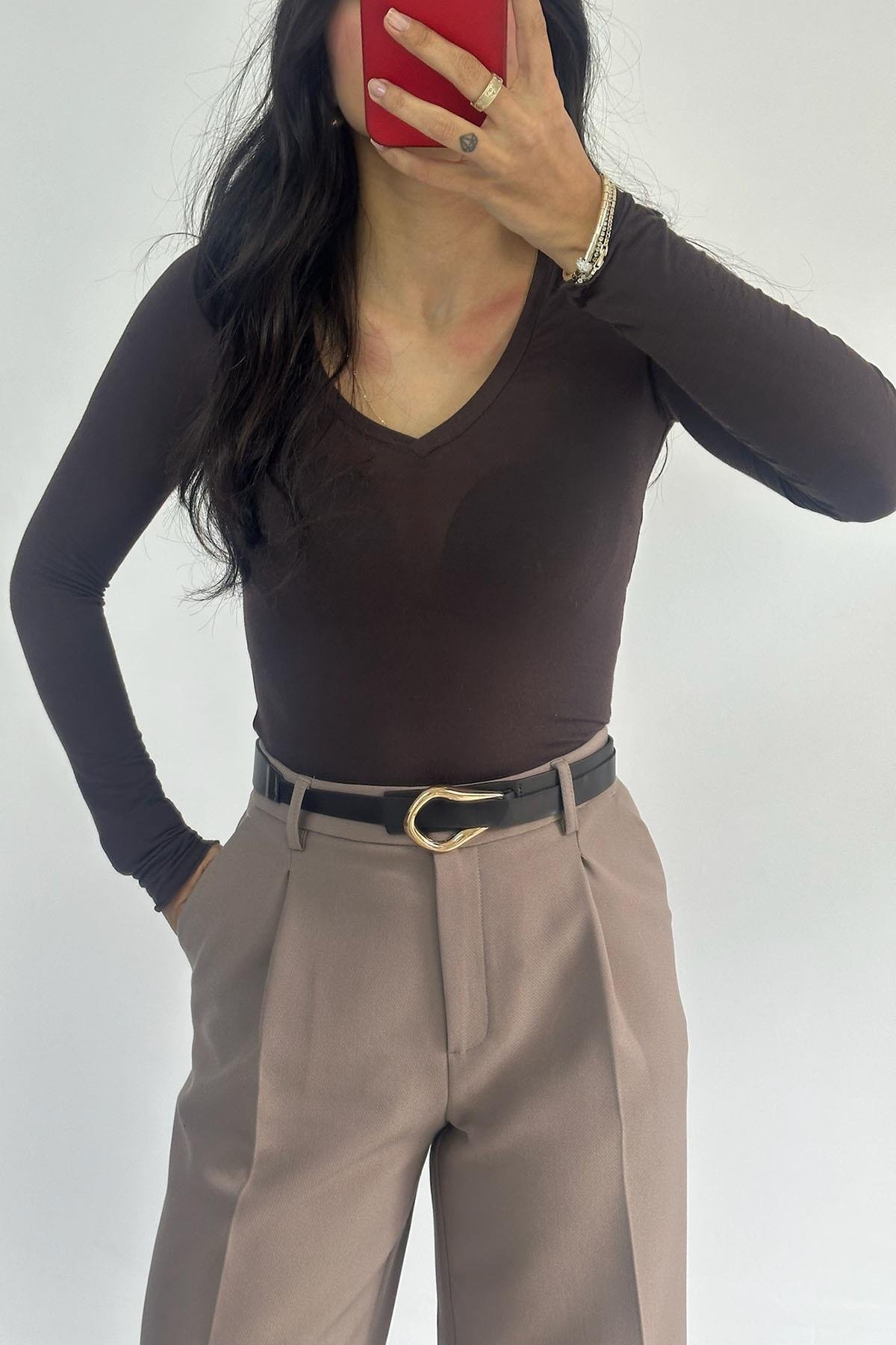 V Yaka Kaşmir Kahve Bluz