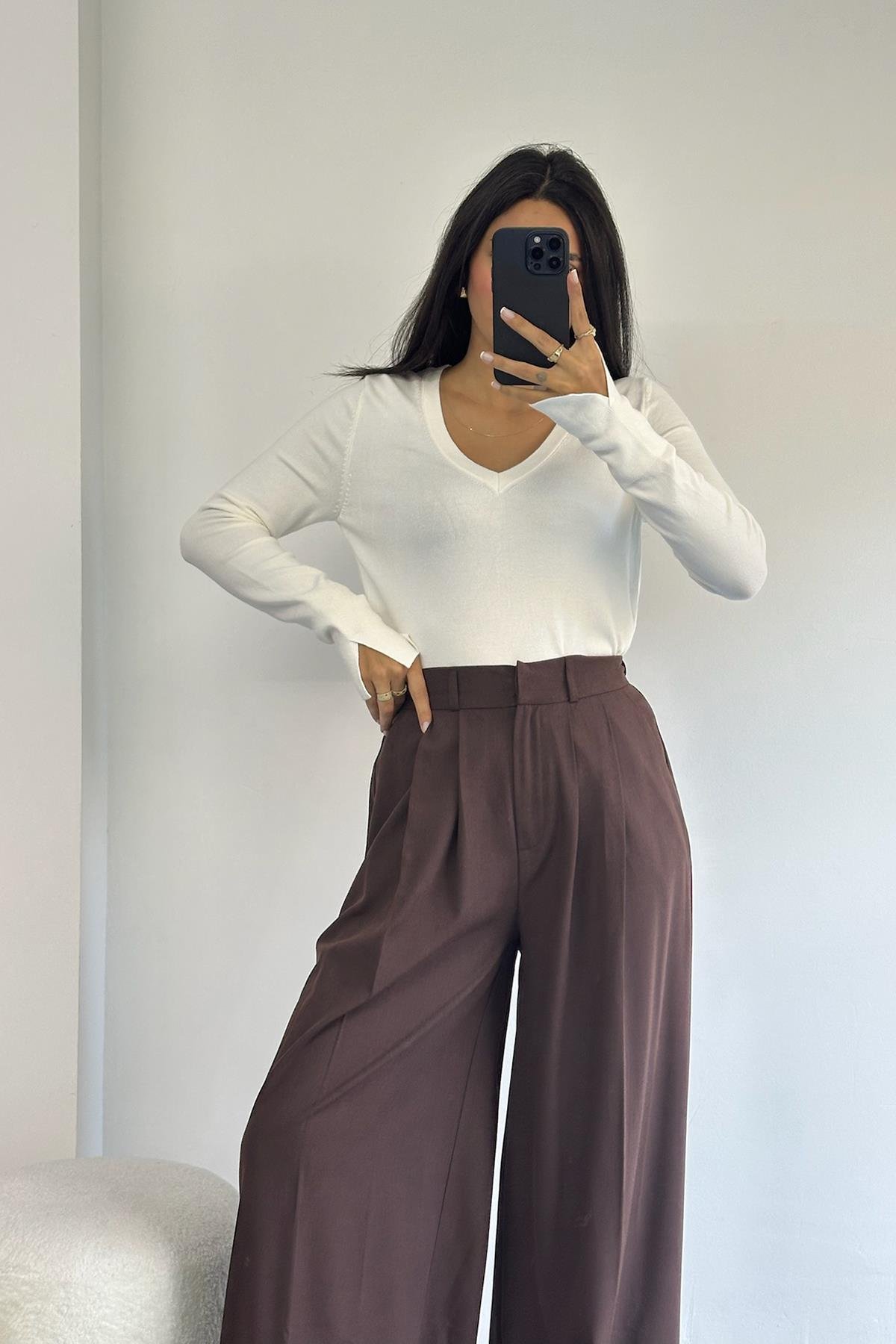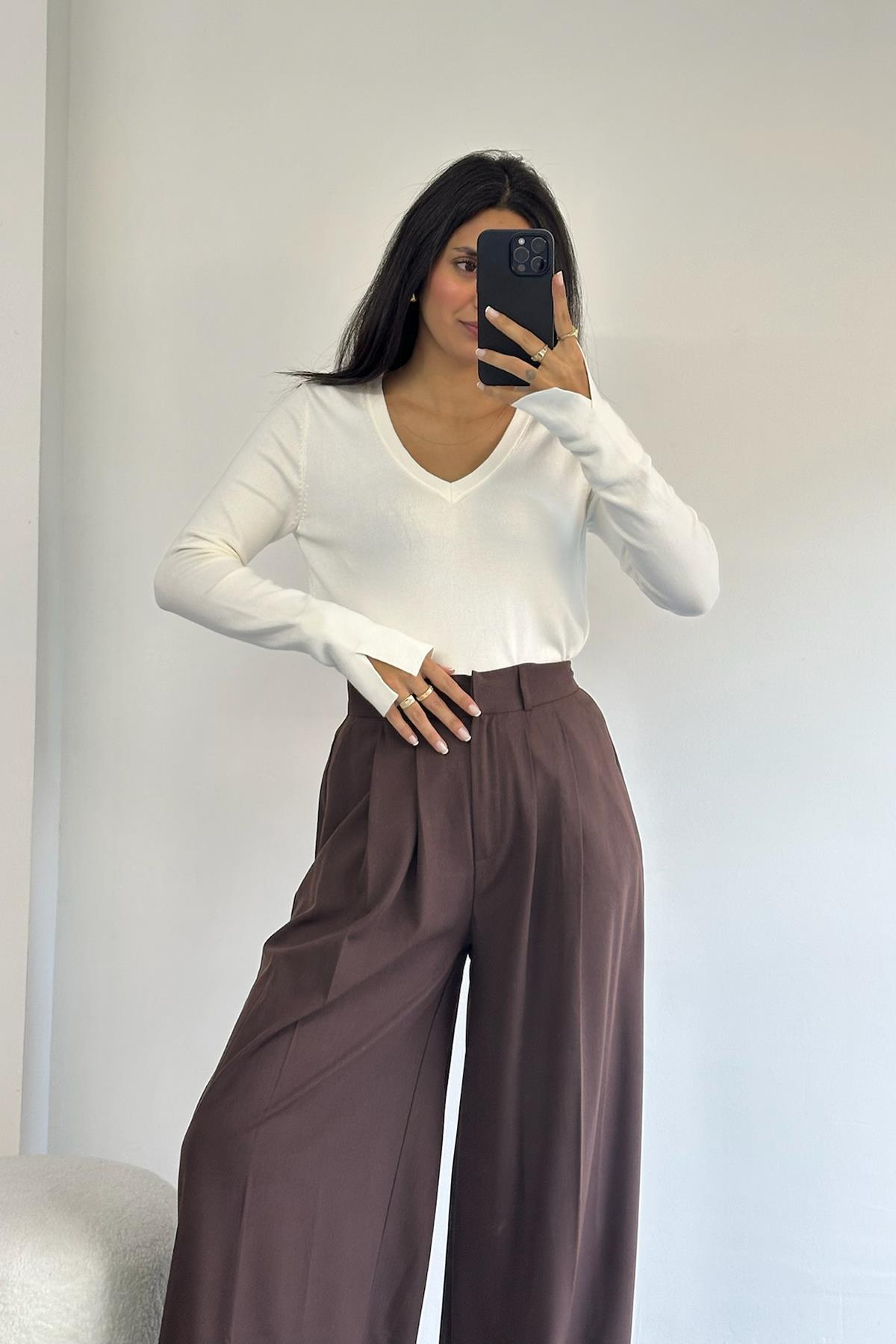 V Yaka Kolu Yırtmaçlı Ekru Kazak