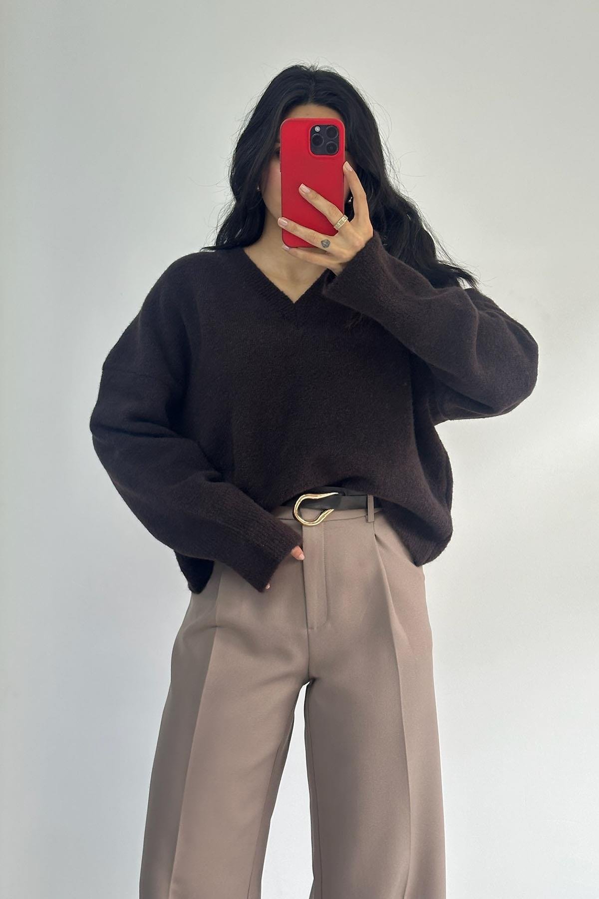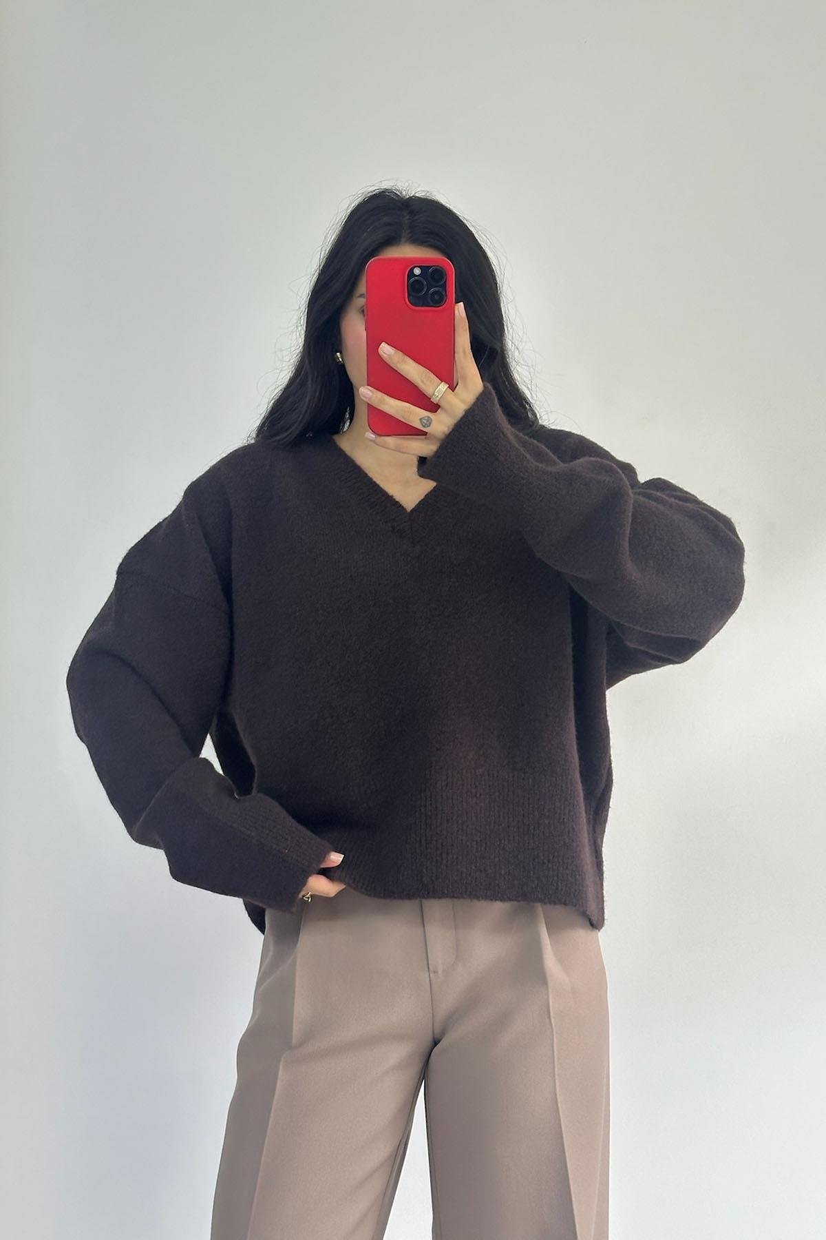 V Yaka Yumuşak Dokulu Koyu Kahve Triko Kazak