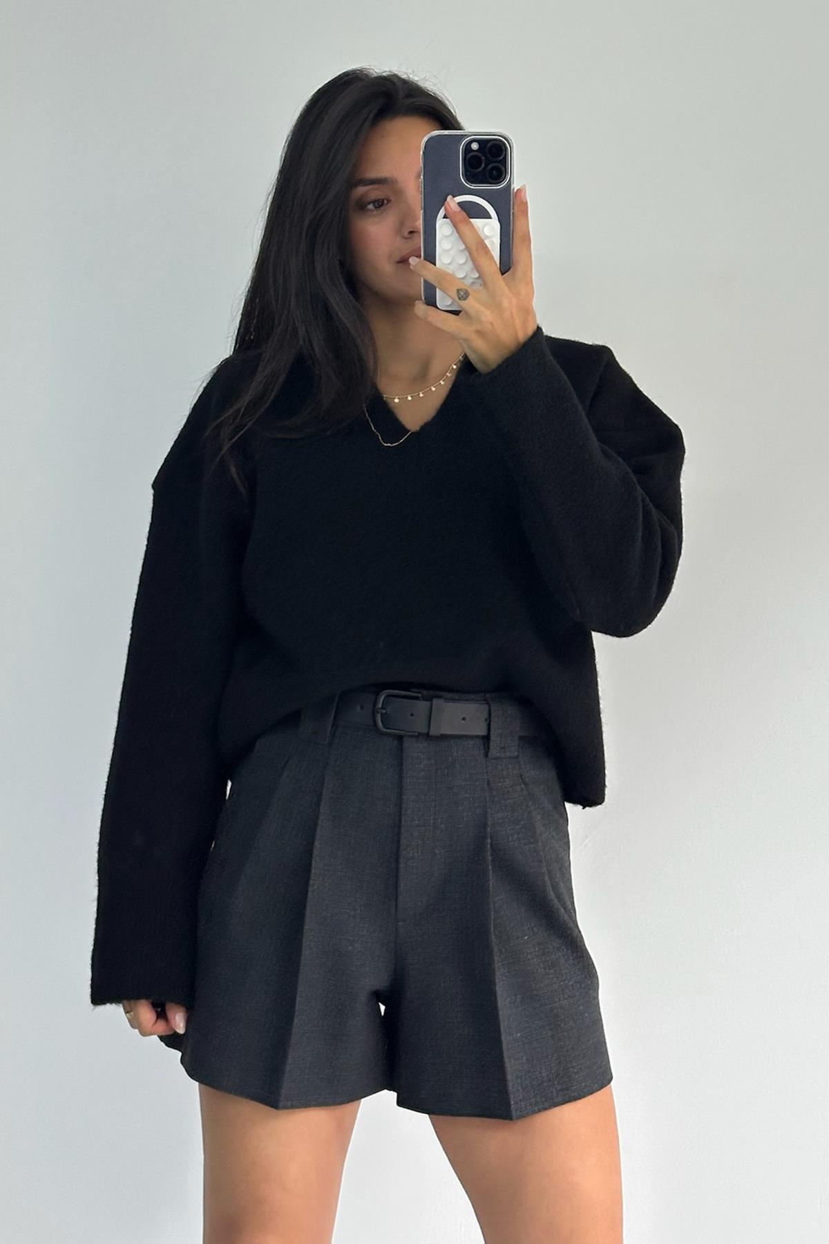 V Yaka Yumuşak Dokulu Siyah Triko Kazak