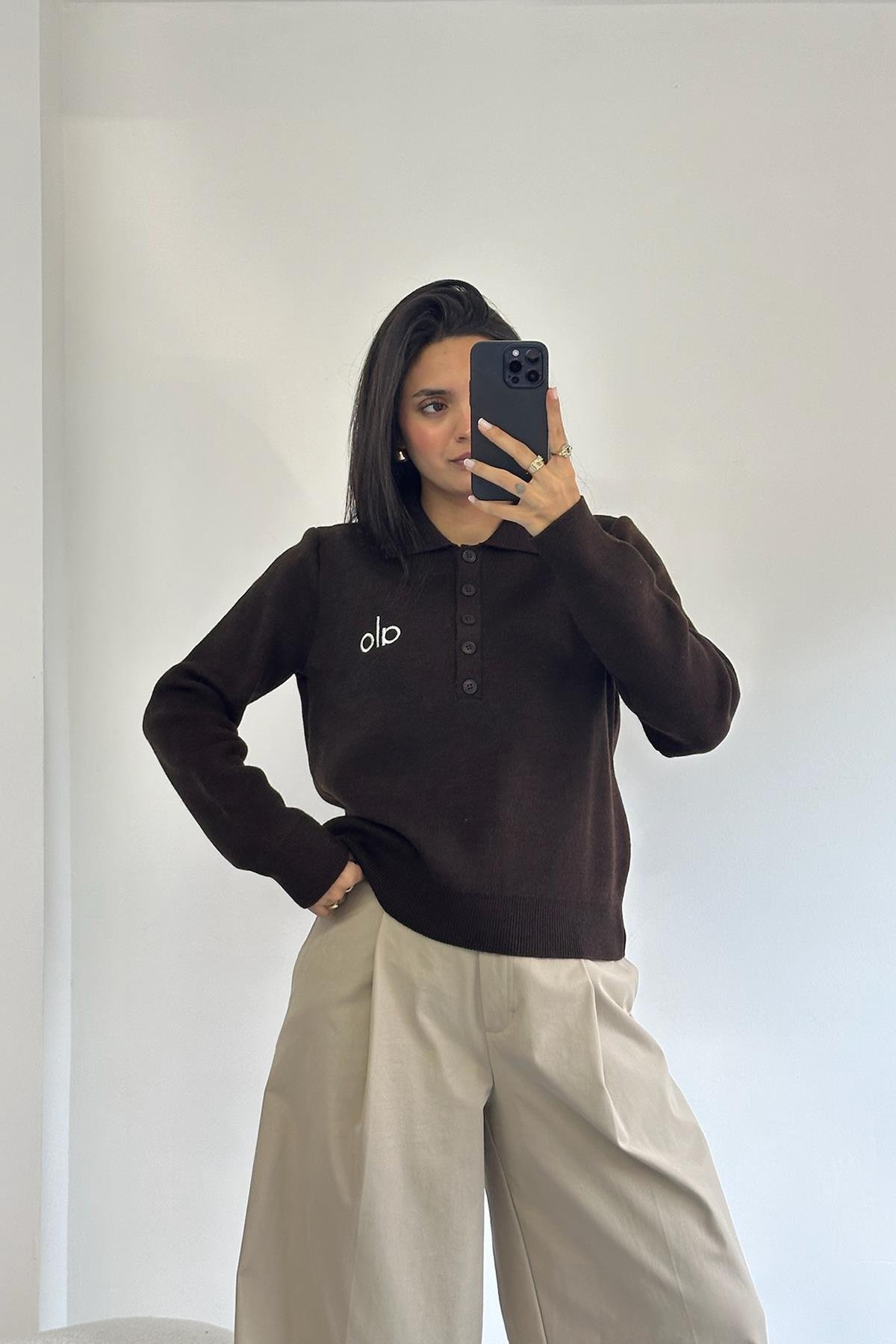 Yakalı Düğmeli Koyu Kahve Kazak