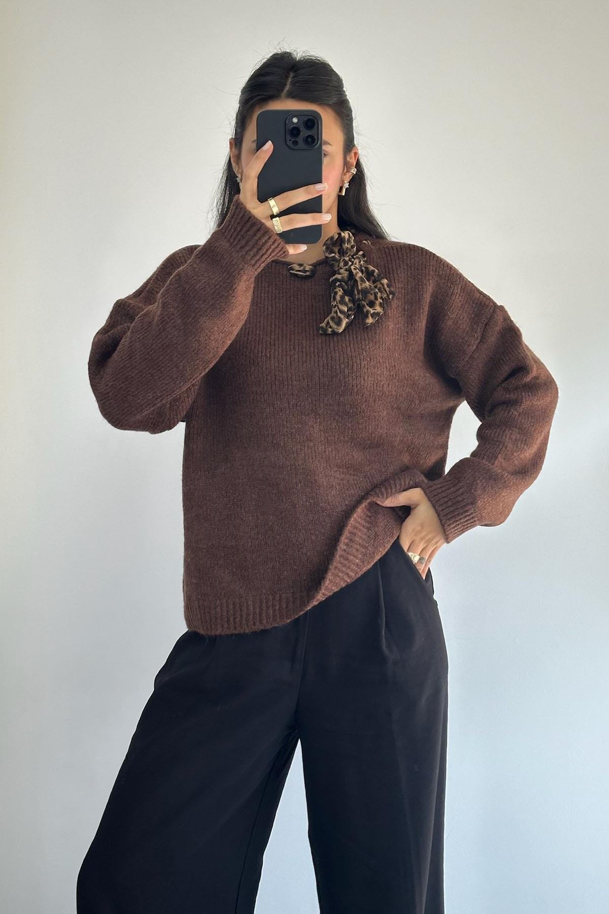 Yakası Fularlı Kahve Kazak