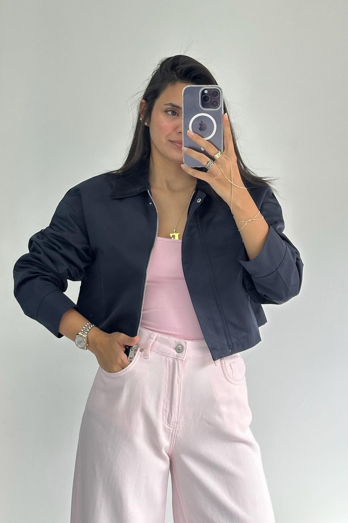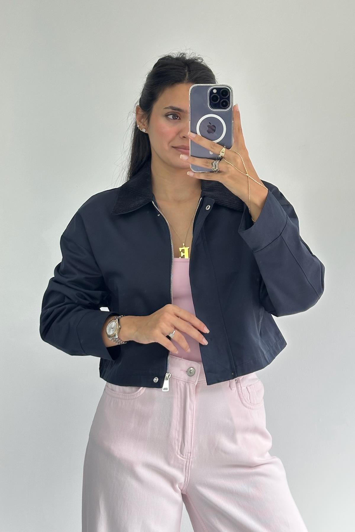 Yakası Kadife Lacivert Bomber Ceket